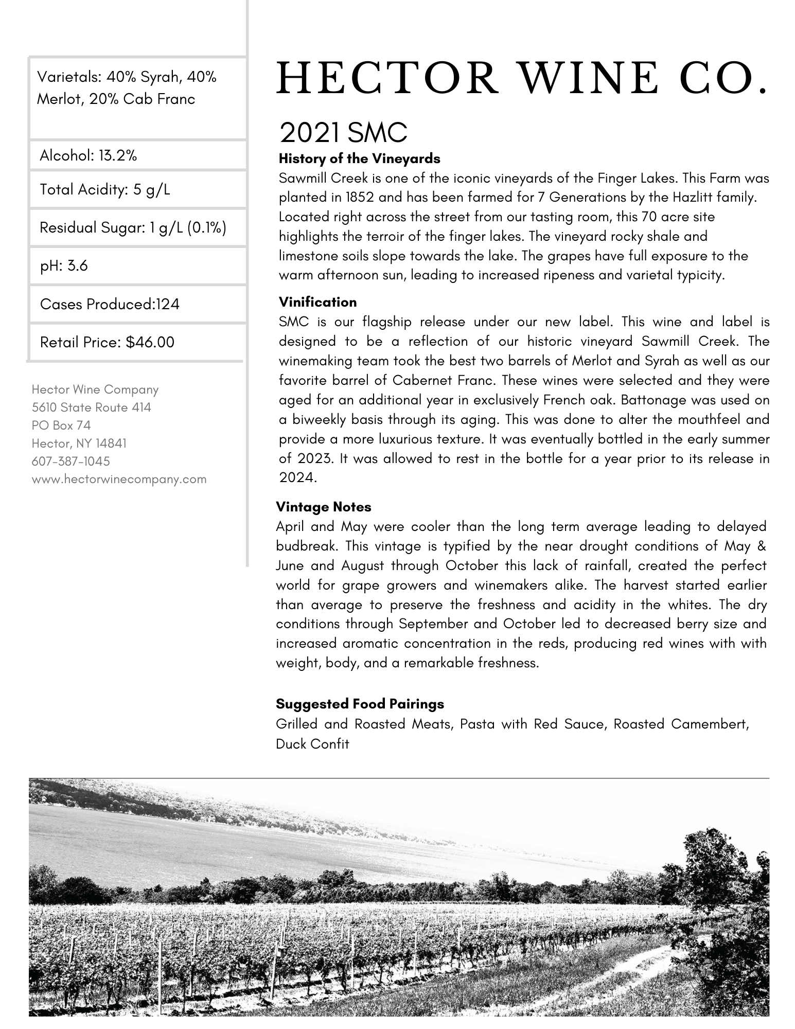 SMC is our flagship release under our new label. This wine and label are designed to be a reflection of our historic vineyard, Sawmill Creek. The winemaking team took the best two barrels of Merlot and Syrah, as well as our favorite barrel of Cabernet Franc. These wines were selected and they were aged for an additional year in exclusively French Oak. Battonage was used on a biweekly basis through the aging process. This was done to alter the mouthfeel and provide a more luxurious texture. It was eventually bottled in the early summer of 2023 and was allowed to rest in bottle for a year before its release in 2024.
