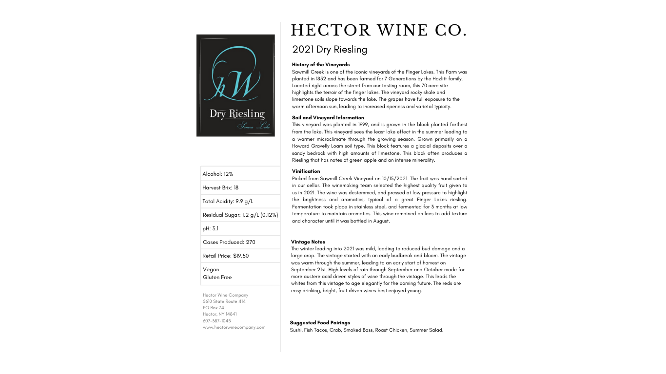 Picked from Sawmill Creek Vineyard on October 15, 2021. The fruit was hand sorted in our cellar. The winemaking team selected the highest quality fruit given to us in 2021. The wine was destemmed and pressed at low pressure to highlight the brightness and aromatics typical of a great Finger Lakes Riesling. Fermentation took place in stainless steel and fermented for 3 months at low temperature to maintain aromatics. The wine remained on lees to add textures and character until it was bottled in August.