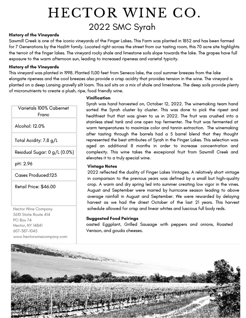 Syrah was hand harvested on, October 12, 2022. The winemaking team hand sorted the Syrah cluster by cluster. This was done to pick the ripest and healthiest fruit that was given to us in 2022. The fruit was crushed into a stainless steel tank and one open top fermenter. The fruit was fermented at warm temperatures to maximize color and tannin extraction. The winemaking after tasting through the barrels had a 5 barrel blend that they thought represented the best attributes of Syrah in the Finger Lakes. This selection was aged an additional 8 months in order to increase concentration and complexity. This wine takes the excepional fruit from Sawmill Creek and elevates it to a truly special wine.