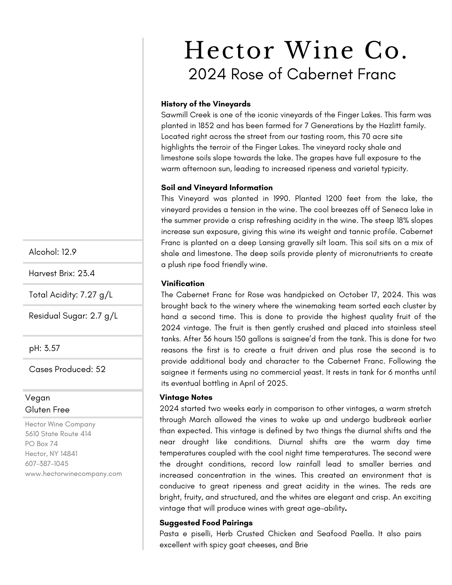 The Cabernet Franc for Rose was handpicked on October 17, 2024. This was brought back to the winery where the winemaking team sorted each cluster by hand a second time. This is done to provide the highest quality fruit of the 2024 vintage. The fruit is then gently crushed and placed into stainless steel tanks. After 36 hours 150 gallons is saignee’d from the tank. This is done for two reasons the first is to create a fruit driven and plus rose the second is to provide additional body and character to the Cabernet Franc. Following the saignee it ferments using no commercial yeast. It rests in tank for 6 months until its eventual bottling in April of 2025.